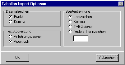 Die zu importierenden Spalten müssen mit vordefinierten Zeichen oder eigenen Zeichen beim Import voneinander getrennt sein. Nicht druckbare Zeichen können als ASCII-Nummer mit führendem # eingegeben werden (#9 ist das Tabulator-Zeichen). Leerzeichen, es kann eines oder mehrere sein. Tab-Zeichen werden in Leerzeichen umgewandelt, wenn nicht TAB-Zeichen gewählt ist.