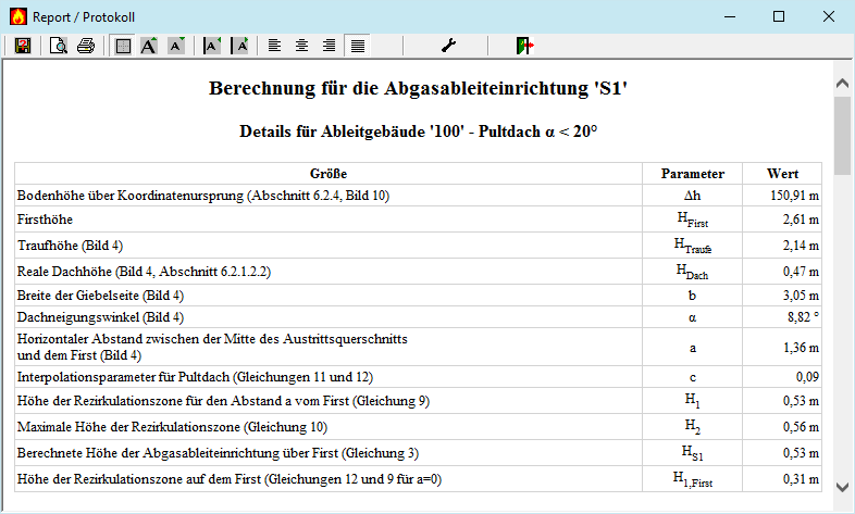 Die Farben zeigen die erforderlichen Schornsteinhöhen, die auf Basis der zu dieser Zeit bekannten Daten (Gebäude, Zuluftöffnungen etc.) ermittelt wurden. Die Daten des Schornsteins sind nun auch im Formular “Ableiteinrichtung”.