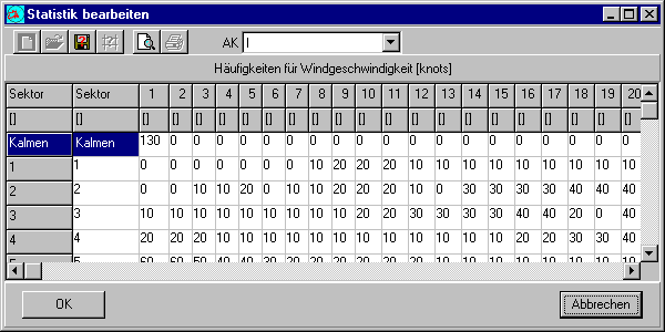 In diesem Formular können die Ausbreitungsklassenstatistiken nach TA Luft oder DWD modifiziert werden. Mit dem in der Werkzeugleiste befindlichen Selektor AK kann die zu bearbeitende Klasse eingestellt werden. Die Spalten der Tabelle zeigen die verschiedenen Windgeschwindigkeitsklassen an. Die Reihen der Tabelle zeigen die Sektoren in Dekagrad und im DWD-Format die Kalmen und umlaufenden Winde an.