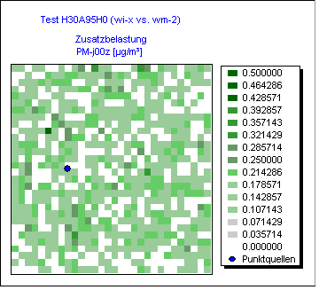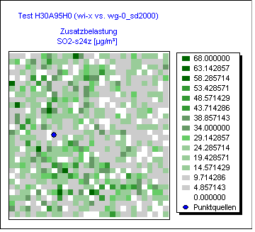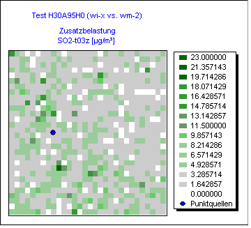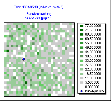 Wie man unten sehen kann gibt es durchaus Abweichungen bei den verschieden kompilierten Versionen von AUSTAL2000, jedoch sieht man auch das die von uns modifizierte Variante (wm-x) exakt die gleichen Ergebnisse liefert wie die Varianten wi-x und li-x. Die Abweichungen zwischen wi-x vs. wg-0 und wi-x vs. lg-0 lassen sich auf programm-interne Rundungsunterschiede zurückführen und liegen sicherlich im Rahmen der statistischen Unsicherheit. Die beiden Berechnungen mit sd=2000 zeigen auf, dass bei niedrigem QS (hier -2) die statistische Unsicherheit relativ hoch ist und es deshalb entsprechend große Abweichungen zwischen den Ergebnissen gibt. Dieses betrifft insbesondere die Kurzzeitwerte. Wie in der AUSTAL2000 Dokumentation beschrieben ist es wichtig die statistische Unsicherheit zu überprüfen und evtl. höhere QS zu benutzen.