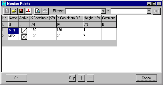 Form for the definition of monitor-points or evaluation points. These elements can also be placed in Graphical Tools for drawing objects.